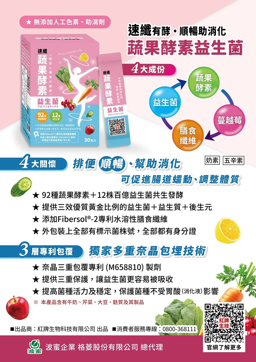 含92種蔬果酵素以及12種益生菌,另添加專利水溶性纖維