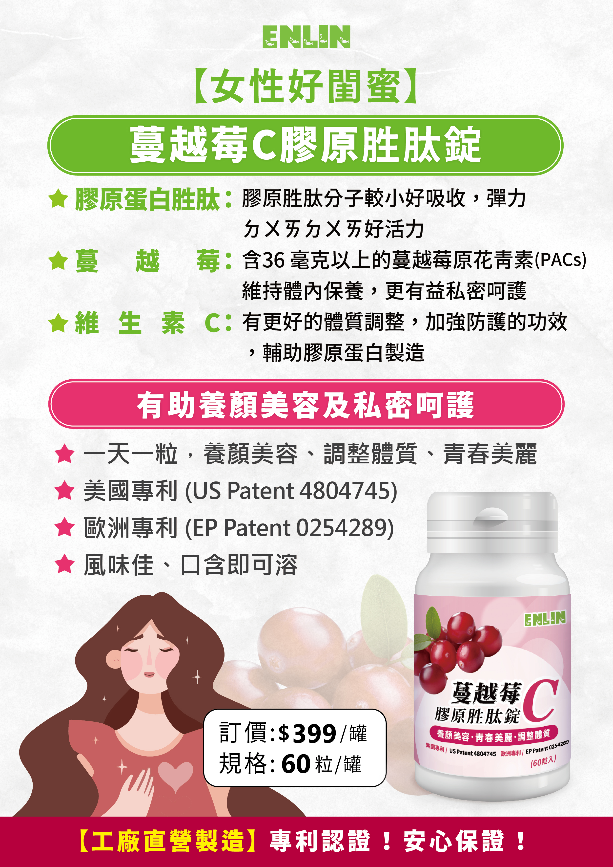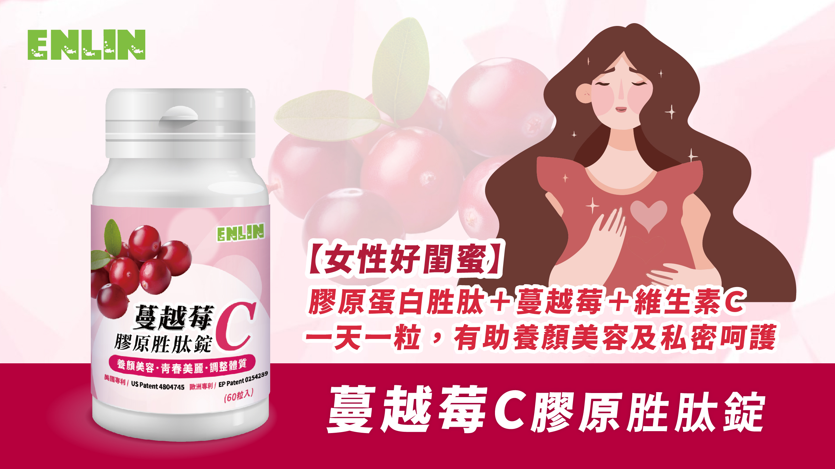 ✦專為女性朋友開發出有助養顏美容及私密呵護的【蔓越莓C膠原胜肽錠】的新產品,風味佳、口含即可溶,一天一粒,養顏美容、調整體質、青春美麗!